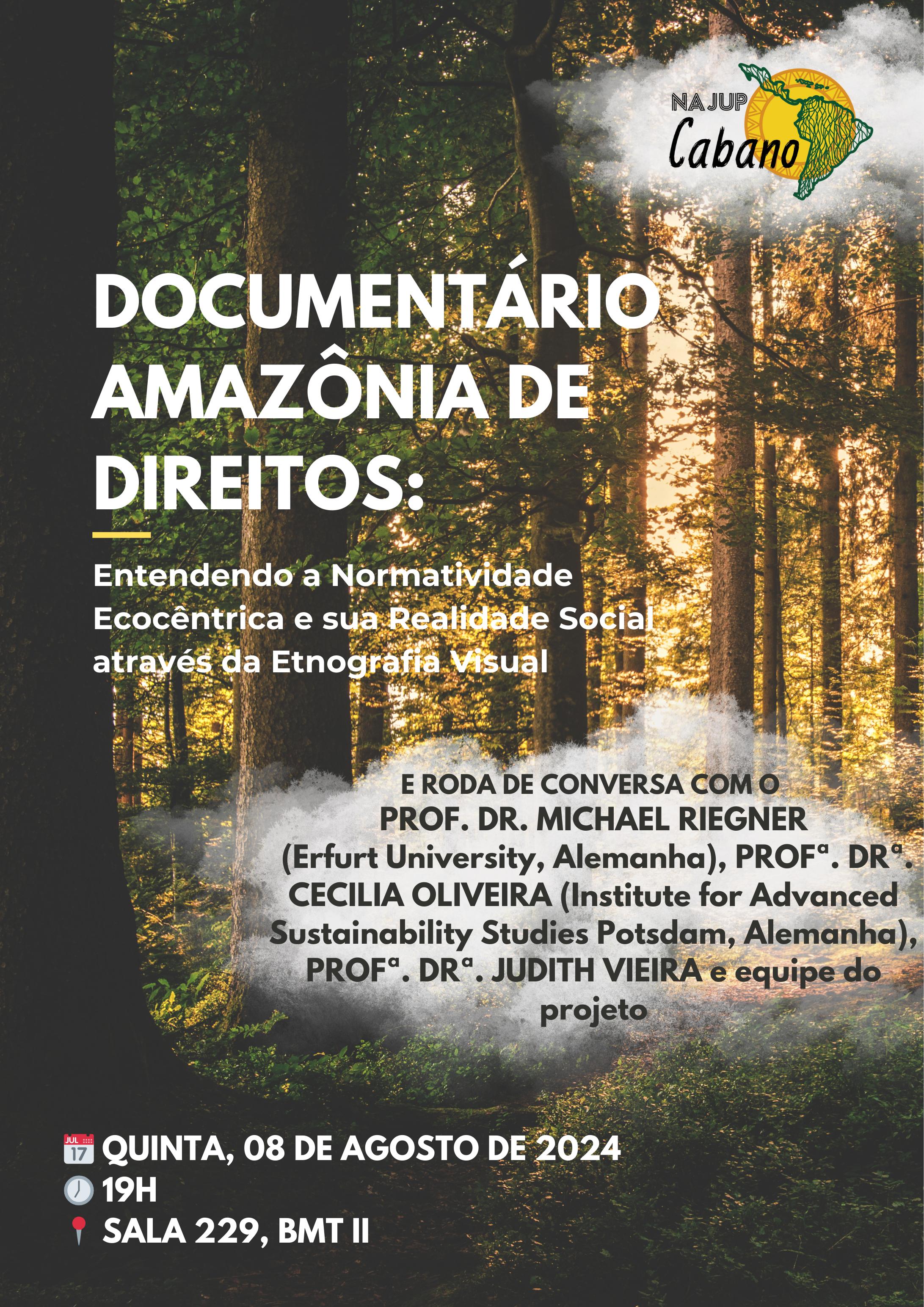 11/08/2024 - TalkThe Popular University Legal Advice Center - NAJUP Cabano and the Legal Anthropology class of the Law department at UFOPA invited Cecilia Oliveira and Michael Riegener to a discussion about the project “Amazon of Rights: Understanding Ecocentric Normativity and its Social Realities through Visual Ethnography”.